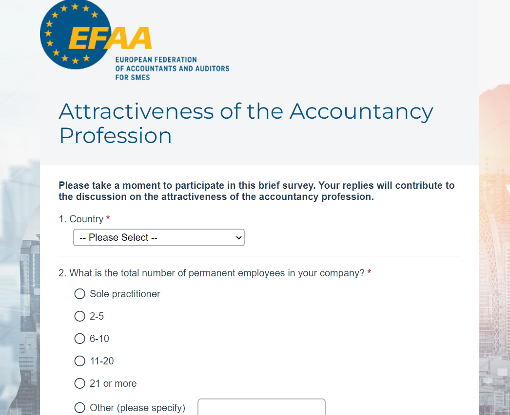Zoals u weet, blijft de aantrekkelijkheid van het beroep een grote uitdaging in de accountancy- en auditwereld, en vooral de kleinere kantoren hebben met een gebrek aan gepaste profielen te kampen. De European Federation of Accountants and Auditors for SMEs (EFAA) zou graag uw stem horen, om zo bij te dragen aan discussies over dit onderwerp en oplossingen te vinden!